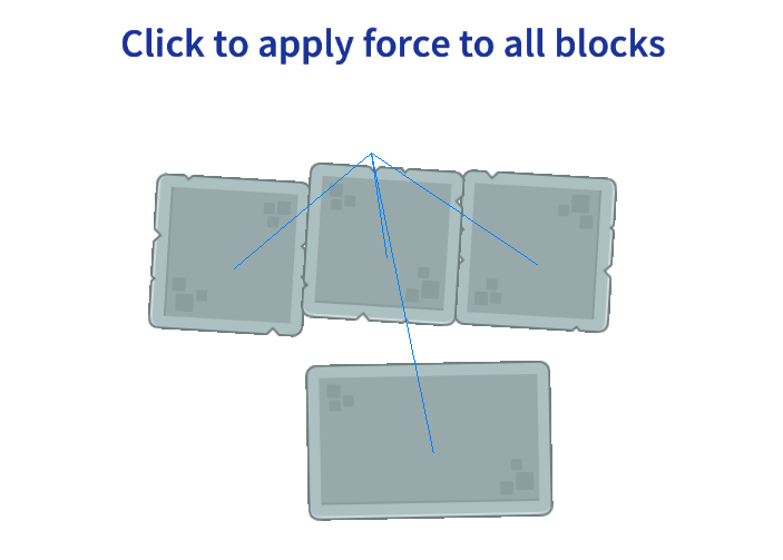 This example shows a simple setup with a dynamic body physics object and two dynamic wheel physics object joined together with a joint of type "hinge". The hinge joint can simulate an axle or a pin on which other object is rotating in respect to the base. The example shows how to create, destroy and change properties of the joints.