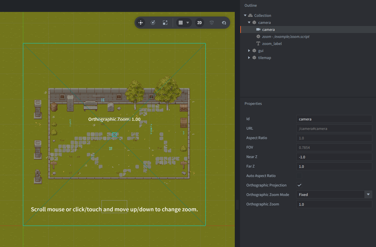 This example shows the recommended setup for gameplay zoom with an orthographic camera: keep the camera component in orthographic Fixed mode, then change orthographic_zoom from script.