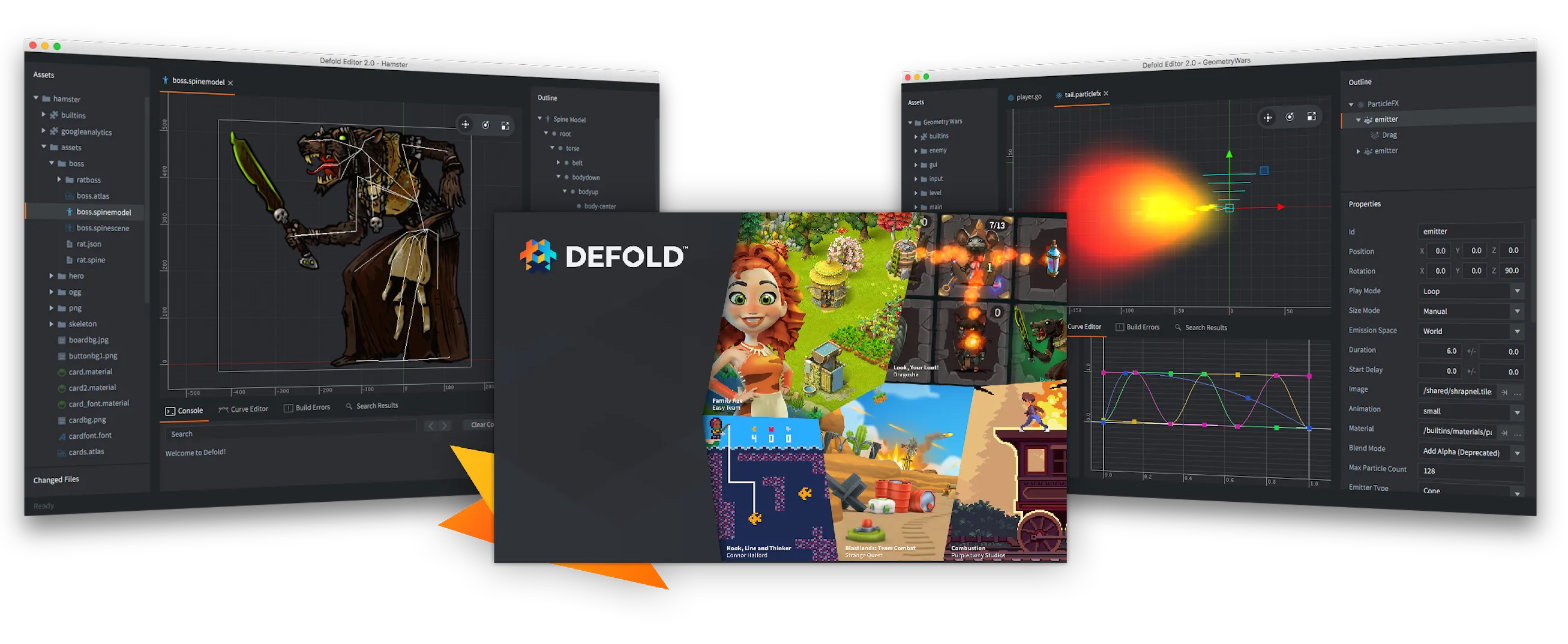 Juice up your visuals with Defold's particle effects, created in the built-in editor with live preview of emitter and modifier behavior.