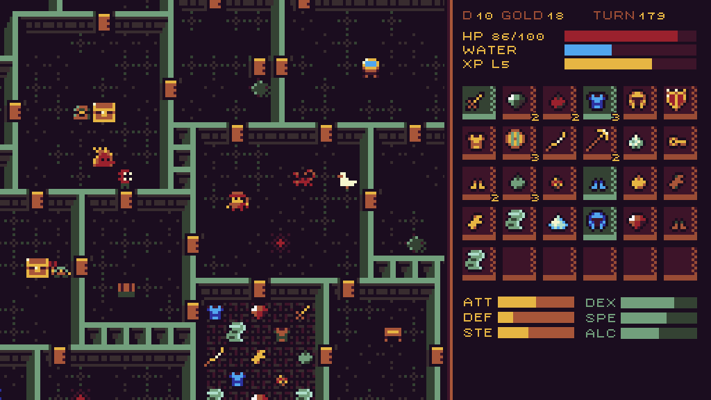 Honestly, I don’t particularly enjoy traditional roguelikes; I find them esoteric and impenetrable. I do, however, really like some aspects of them: randomly generated levels, turn based movement, non-linear gameplay and re-playability. So, my aim is to make a more user friendly roguelike.