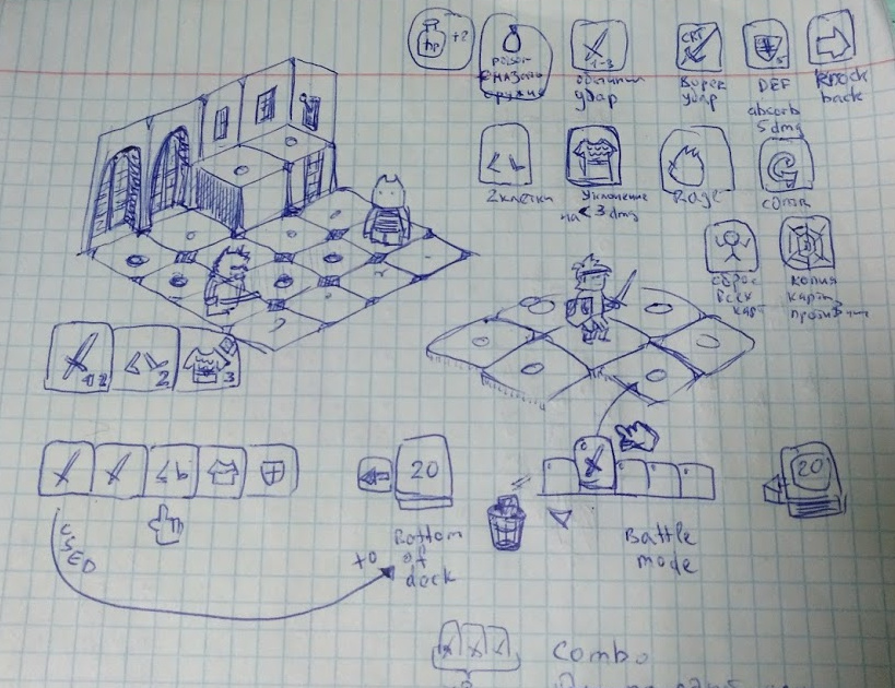 For a long time I wanted to make a card game and periodically wrote down ideas in a special notebook. I made sketches of game situations and simple calculations. The game finally took shape after the playable prototype, where basic game mechanics were matched to graphics.