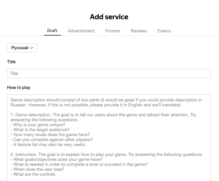 It is highly recommended that you translate your game to Russian for the best performance on Yandex.