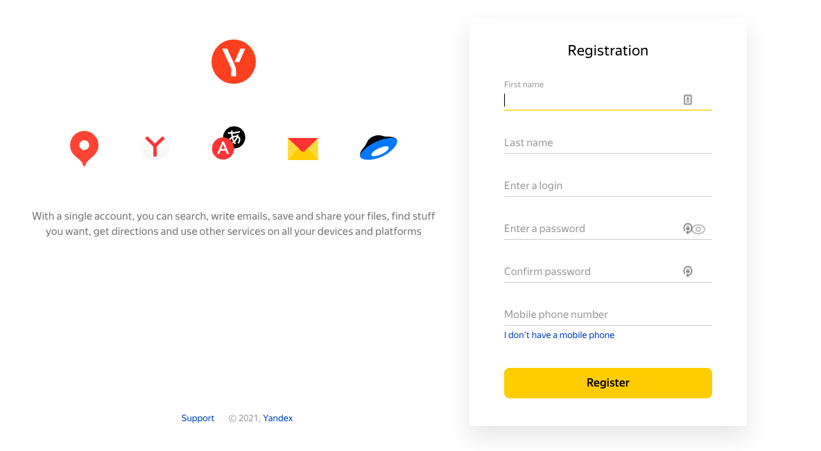 Before anything else you need to create a Yandex account. Head over to the registration page to get started.