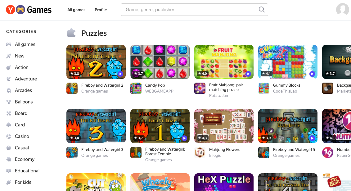 Yandex.Games is a catalog of browser-based online games that can be played on smartphones or desktop devices and require no installation. Most games are also available offline (code for these games is added to the device cache during the first gaming session).