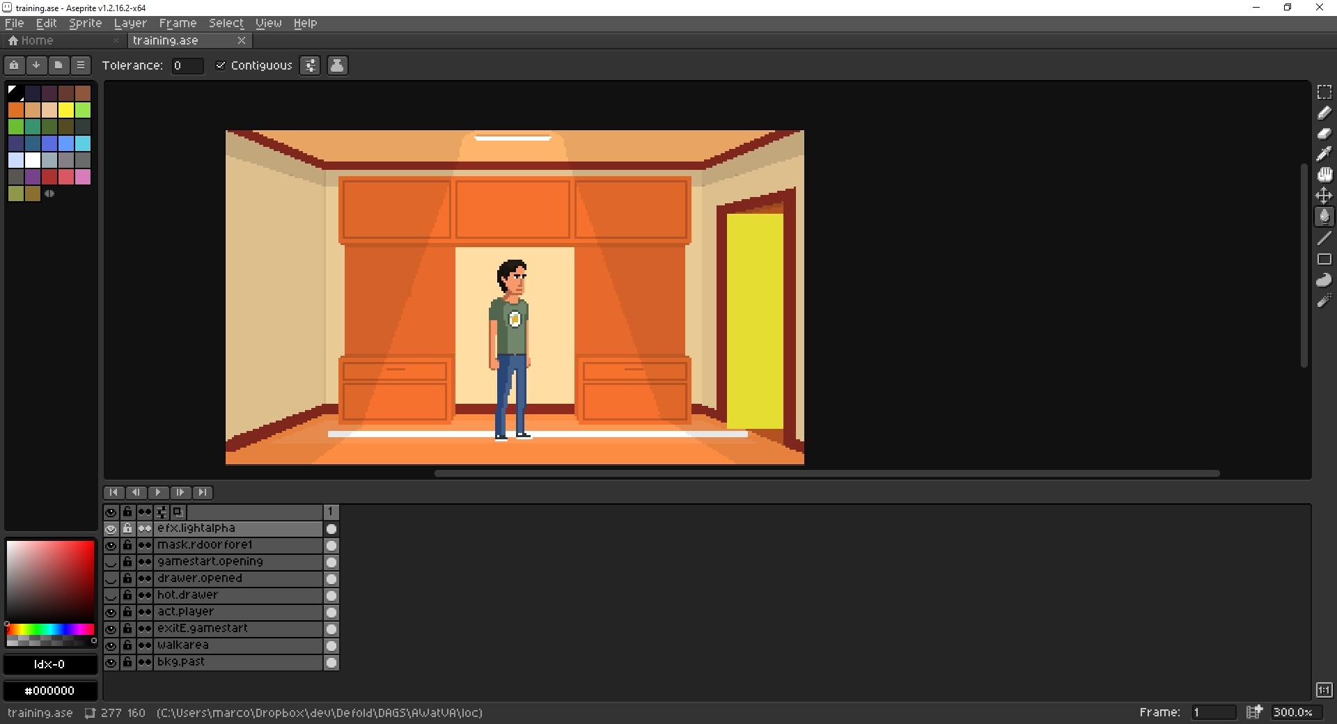 In the image above my script attach a scene to a scene in an Aseprite files - and let me use elements in layers - so that I can do something like if:drawer,opened and setstatus:drawer,opened - and that’s connected to elements defined in the Aseprite file - like hotspot, or object, or graphic version of elements, for a specific state. Another example is setstatus:drawer,opened which will activate the drawer.opened image - that will start as NOT shown, because of layer visibility attributes.