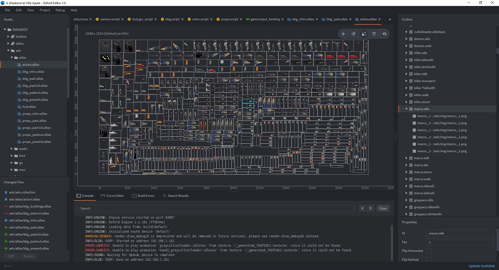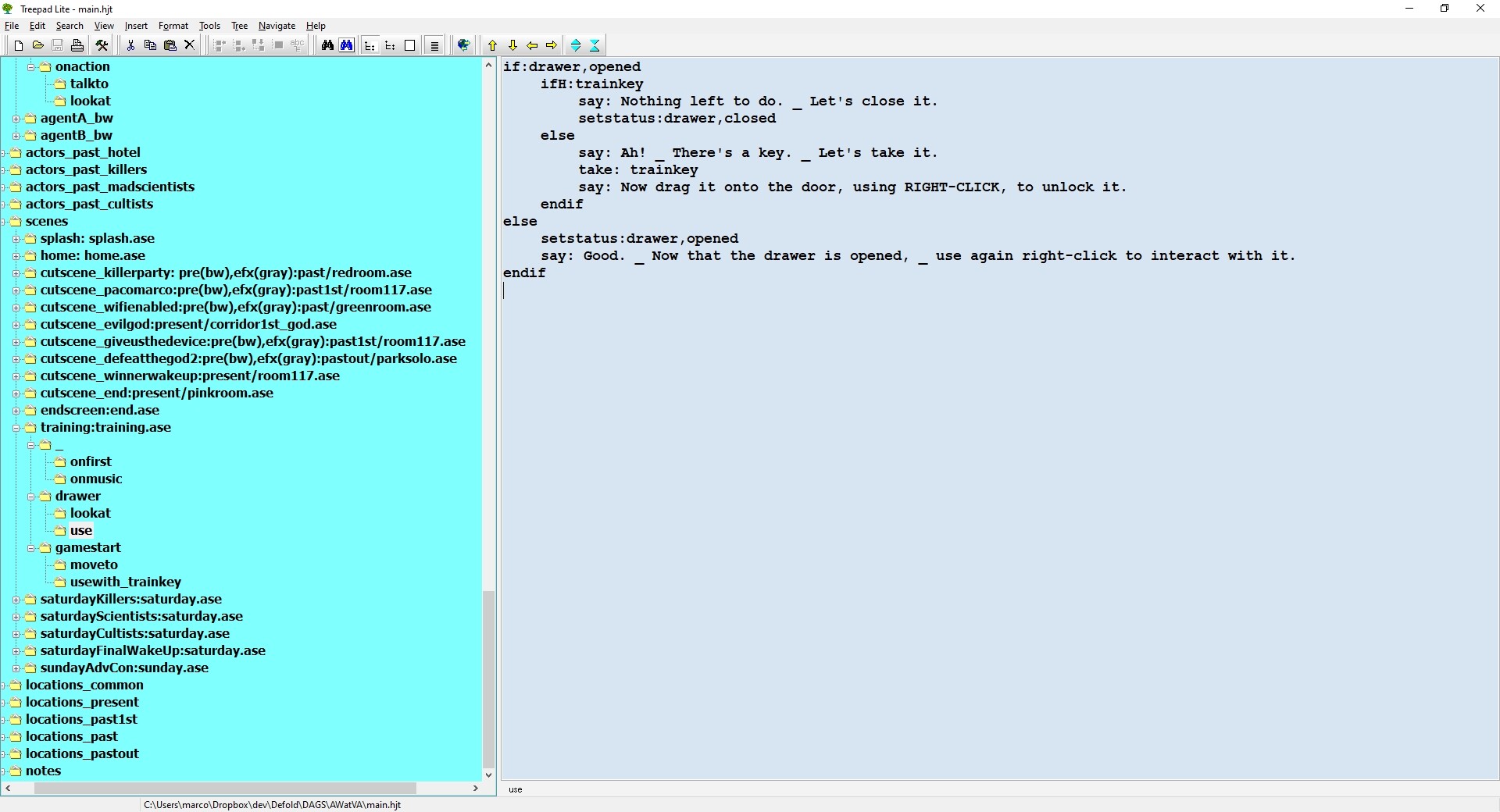 As you can see my game has a lot of animations - but that’s very easy to handle, considering I just do things in Aseprite and then build the corresponding atlas in Defold. Last, but not least, here’s how I handle game code. I use a TreePad Lite file (because it’s handy!) which I convert in a json file (because it works very well inside Defold) and then scan its content to build Defold resources (including sounds and game project data).