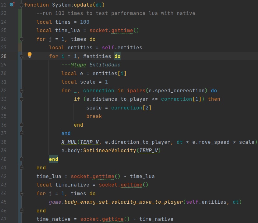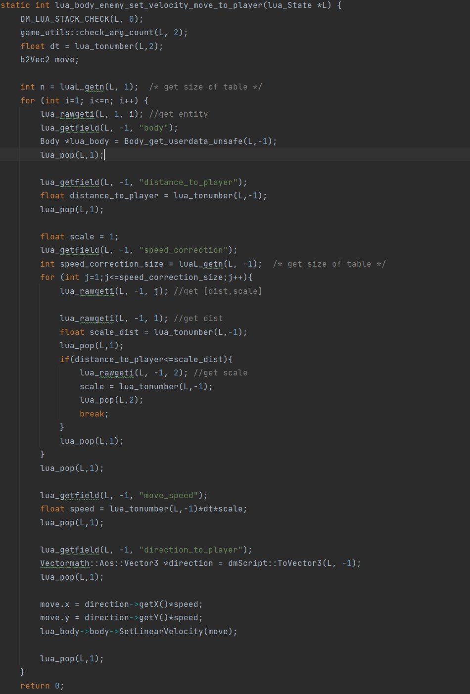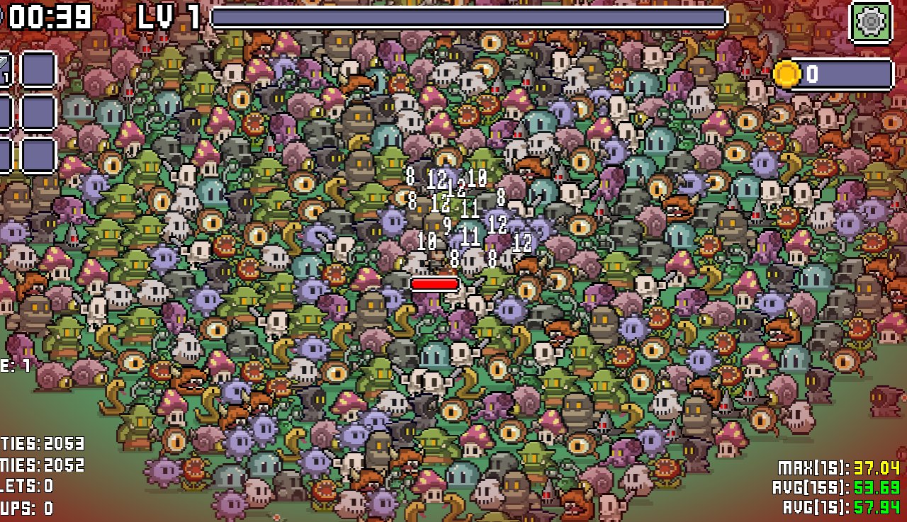 The UpdatePositionFromBodySystem and EnemyMoveSystem systems were moved from Lua to C++ which resulted in a big performance boost. In a desktop build where LuaJIT is used we got between 15-40% performance boost and in an HTML5 build where standard Lua 5.1 is used we saw got between 150-250% boost in performance! 💪
