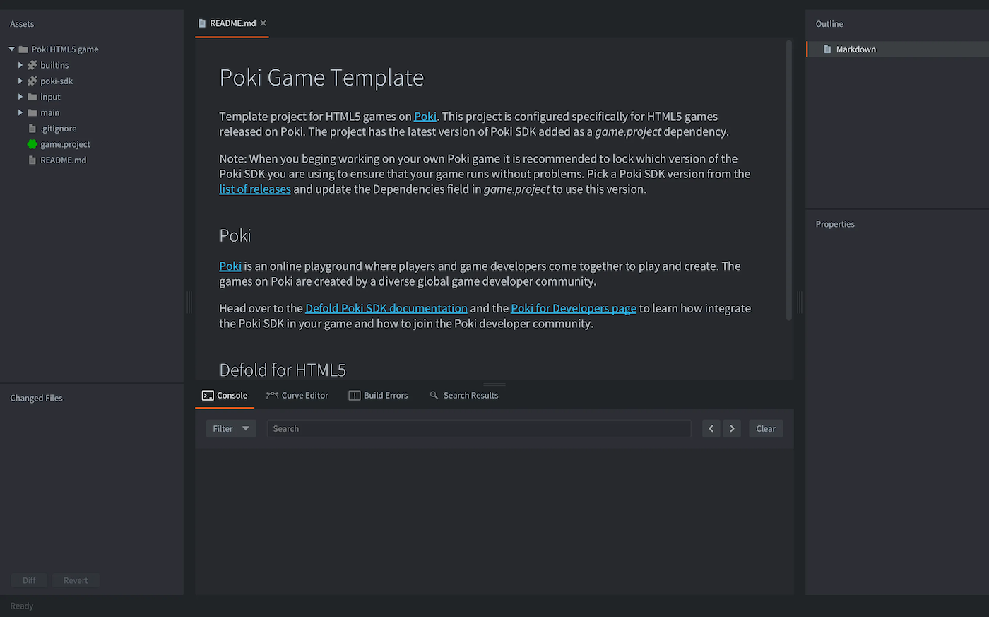The SDK template includes the Poki SDK making it easy to create a game for Poki without having to deal with manually implementing the SDK. It is built specifically for HTML5 games so works like a charm for all things web and Poki. Just open a new project using the template and get going on your game without worrying about adding the SDK later.