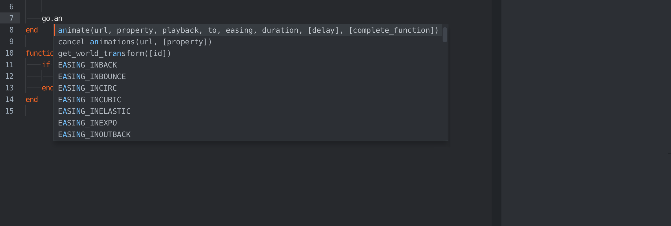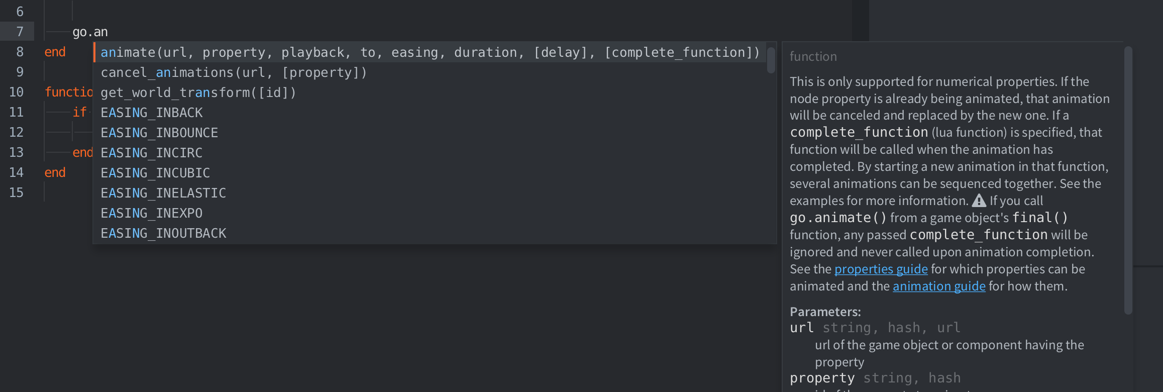 The built-in code editor will show code completion of functions while writing code: