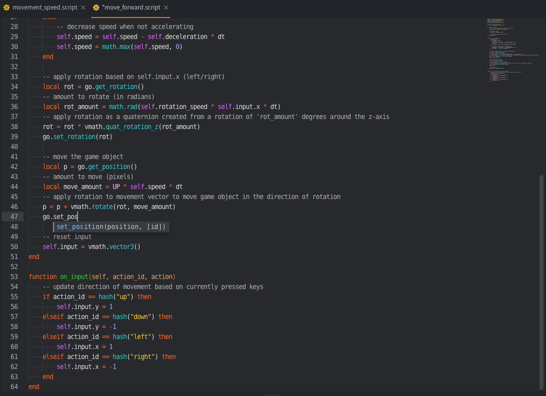Defold has a built-in code editor that allows you to open and edit Lua files (.lua), Defold script files (.script, .gui_script and .render_script) as well as any other file with a file extension not natively handled by the editor. Additionally the editor provides syntax highlighting for Lua and script files.
