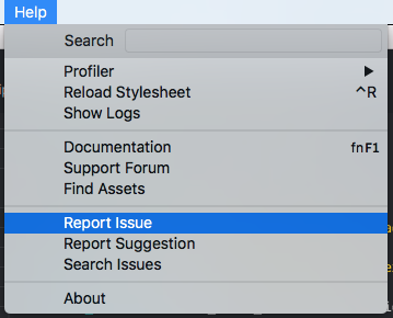 Редактор предоставляет удобный способ сообщения о проблемах. Выберите опцию меню Help->Report Issue из редактора, чтобы сообщить о проблеме.