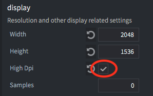 这将在支持高DPI的显示器上创建高DPI的后台缓冲区。游戏将以宽度和高度设置中设置的双倍分辨率渲染,这些设置仍将是脚本和属性中使用的逻辑分辨率。这意味着所有测量值保持不变,任何以1x比例渲染的内容看起来都一样。但是,如果您导入高分辨率图像并将它们缩放到0.5x,它们在屏幕上将是高DPI的。