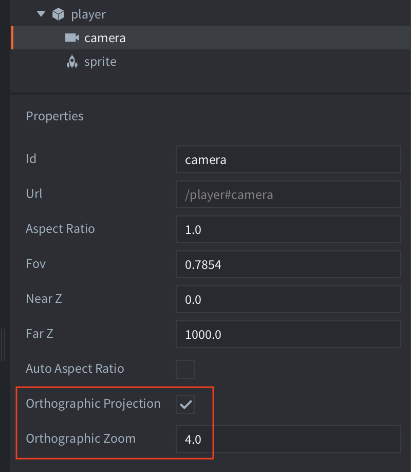相同的结果也可以通过将相机组件附加到游戏对象并勾选正交投影,将正交缩放设置为4.0来实现: