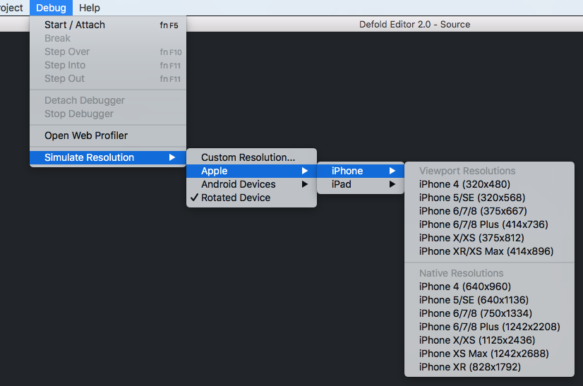 调试菜单包含一个选项,用于模拟特定设备型号分辨率或自定义分辨率。当应用程序运行时,您可以选择Debug->Simulate Resolution并从列表中选择一个设备型号。运行的应用程序窗口将调整大小,您将能够看到您的游戏在不同分辨率或不同宽高比下的外观。