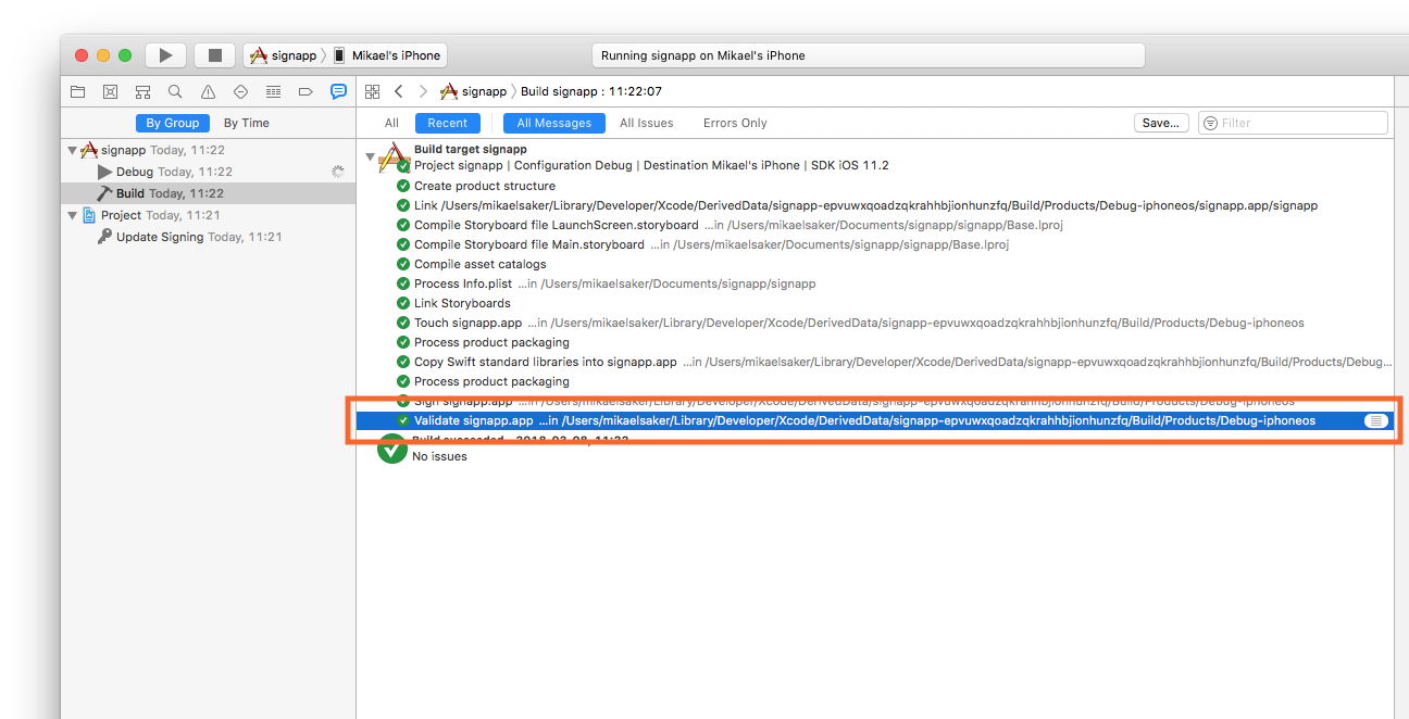 当你验证应用可以正常工作后,在磁盘上找到它。你可以在”报告导航器”的构建报告中查看构建位置。